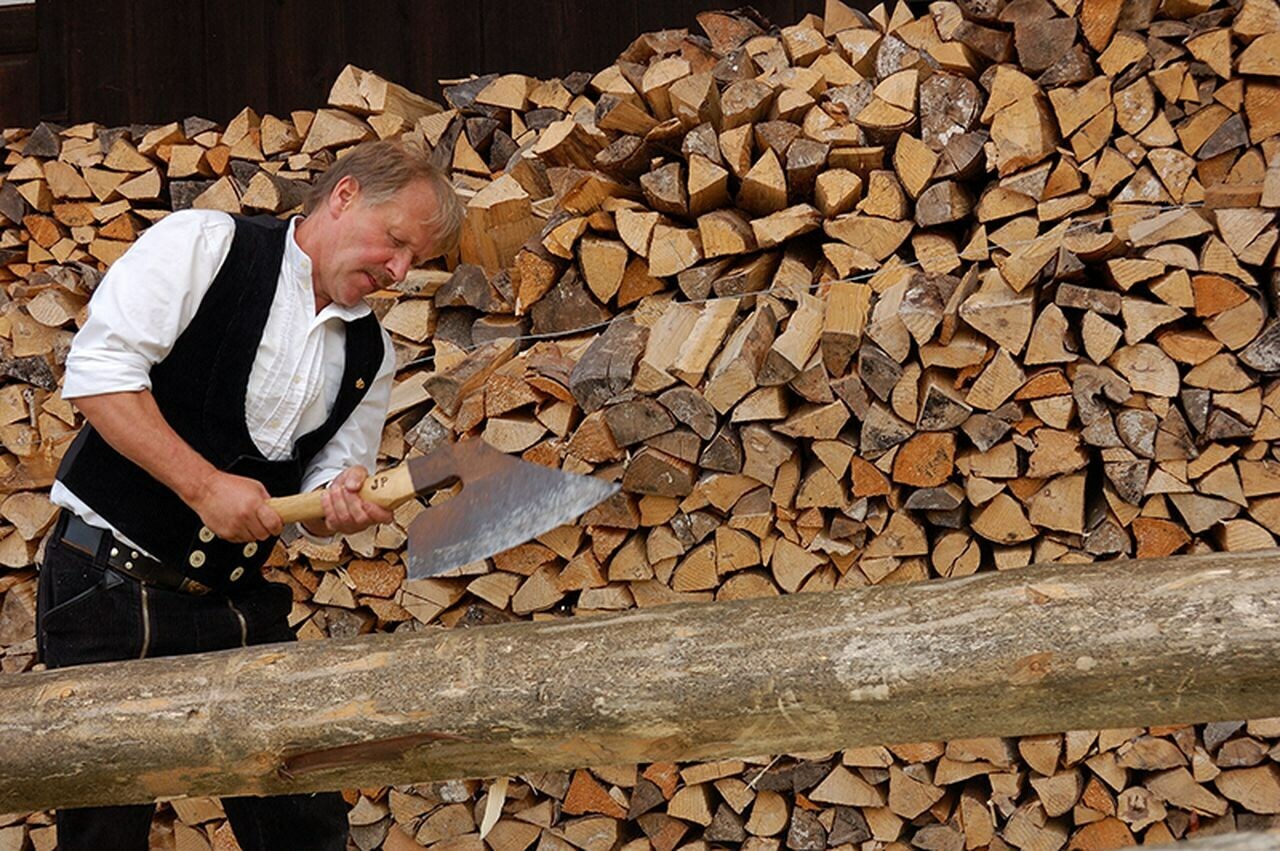 Bei den Holzschneflertagen bearbeiten Bernauer Zimmermänner große Baumstämme. Foto: Heike Budig
